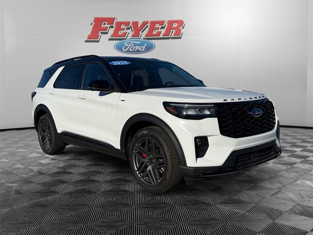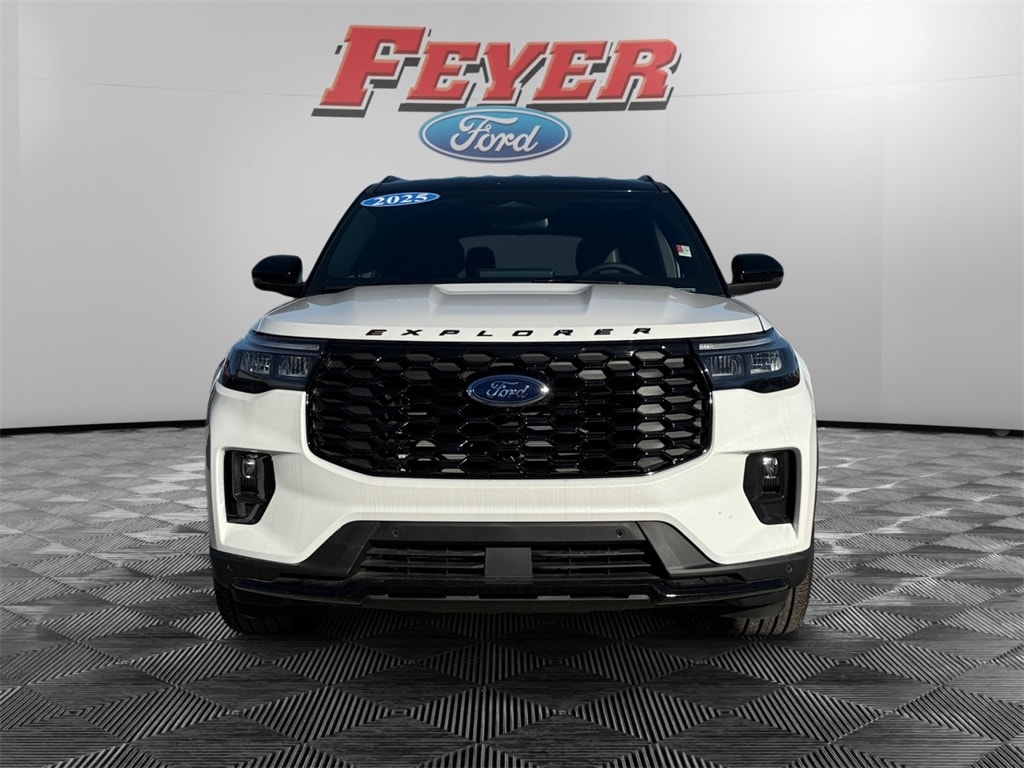Star White Metallic Tri-Coat 2025 Ford Explorer ST-Line RWD 10-Speed Automatic 2.3L EcoBoost I-4 Pre-Collision Assist with Automatic Emergency Braking w/Pedestrian Detection, Adaptive Cruise Control/Lane Centering System, Bluetooth (Handsfree) Phone, Ford Digital Experience, Google Assistant, Google Maps, Google Play, Waze Navigation Integration, Apple CarPlay® and Android AutoTM Wireless Compatibility, 13.2" Color LCD Touchscreen, Alexa Built-In, SiriusXM Satellite Radio, Voice Controlled iPod/Mp3 input/USB port, Ford CoPilot 360, Heated Rear Seats, Keyless Entry Keypad, Heated Seats, 911 Assist, 360-Degree Camera, Lane Keeping System, Automatic High-Beam Headlamps, FordPass Connect w/5G Modem, Wi-Fi Hotspot, Wireless Charging Pad, Blind Spot Information System (BLIS), Rain-Sensing Windshield Wipers, Rear View Camera, Explorer ST-Line, 110V/150W AC Power Outlet, 2nd Row Heated Seats, Ambient Lighting, Auto High-beam Headlights, Auto-Dimming Interior Rear-View Mirror, Black Painted Roof, Equipment Group 300A Standard Package, Exterior Parking Camera Rear, Front dual zone A/C, Heated steering wheel, Memory Driver's Seat, Navigation System, Performance Brakes, Power Liftgate, Power-Folding Sideview Mirrors w/Autofold, Premium Package, Radio: B&O Sound System by Bang & Olufsen, Rain-Sensing Wipers (Front Only), Red Painted Perf Front & Rear Brake Calipers, ST-Line Street Pack, Wheels: 21" Magnetite-Painted Aluminum, Wireless Charging Pad.